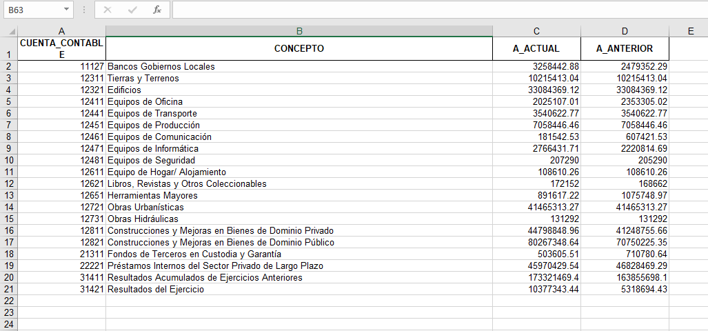 - Estado de Situación Financiera para poder cargar este estado financiero es requisito indispensable que el Estado de Rendimiento Financiero se encuentre en Estado Aprobado, posteriormente cada institución deberá vaciar la información de este EEFF en un archivo de Excel que es proporcionado por el analista de la CGR, el formato al que se hace mención se muestra a continuación: