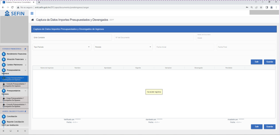 - Estado Comparativo de Importes Presupuestados y Devengados de Ingresos, la carga de esta información es realizada de forma automática, el usuario deberá seleccionar los datos en la pantalla que se muestra a continuación: