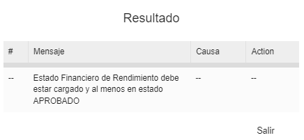 No es un error es una validación ya que debe estar registrado previamente en estado APROBADO el Estado de Rendimiento Financiero.